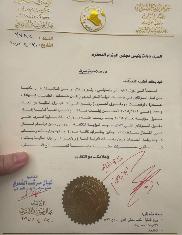 أعلنت النائبة نهال مرشد الشمري، اليوم السبت، عن موافقة رئيس مجلس الوزراء محمد شياع السوداني، على إطلاق مستحقات الموظفين من علاوة واحتساب شهادة ونقل خدمات، بعيدا عن إقرار جداول موازنة العام الحالي.